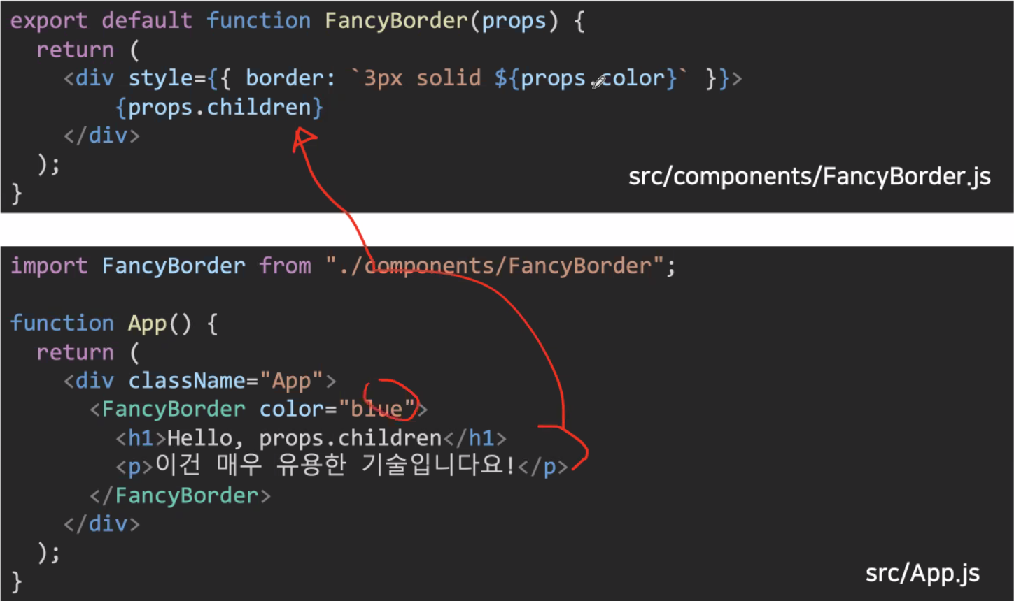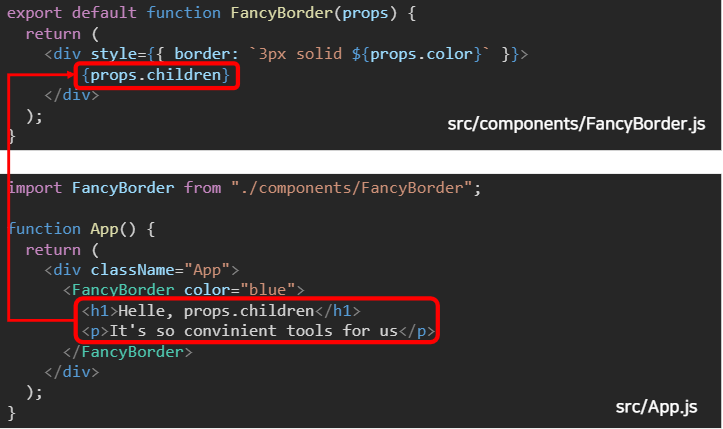 FancyBorder.js 컴포넌트는 props의 자식요소를 보더로 감싸는 역할을 해줍니다.