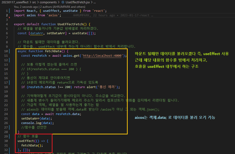 // 함수를 useEffect 내부에 하는게 아니라! 밖에서 처리합니다.