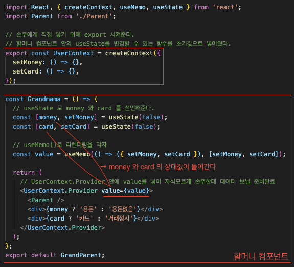 value 안에는 setMoney 와 setCard 가 들어있고 앞으로 개수가 더 추가될 수 있다. 만약 그 중 하나라도 바뀌면 객체로 묶여있으므로 전체가 리렌더링 되는 것이다. 따라서 잘못 쓰면 엄청난 렉을 유발하게 된다.