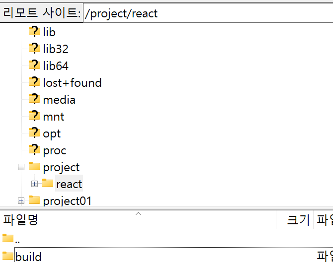 파일질라 최상단에 project/react 폴더 만들고, 그 안에 build 폴더 로컬에서 업로드